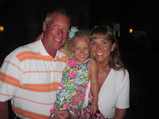 So all that practice walking down the isle and tossing petals Colson did the few weeks before the wedding was pointless. After some convincing, both she and Connor finally started down the isle. But they didn't make it far. Connor got distracted by the fountains and chunked the pillow he was carrying. Colson like the petals in her basket and wanted them to stay there. They both stopped walking with still about 20 yards to go. I was already at the front, so Jon went to try to coax them along. He handed Connor the pillow, which was quickly tossed aside again. Colson was in need of a nap anyway, so there was no convincing her to walk down the isle. It was getting close to time for Ashleigh and Dad to start walking, so I had no choice but to walk back down the isle and get them. I picked up Colson, which upset Connor. Fortunately he was fine once Daddy picked him up. We walked to the front of the isle, and someone, I think Mom, tossed a handful of Colson's petals on the isle. And thus began the meltdown. Colson was so upset that her petals were on the ground and cried the entire ceremony. We did all the parenting "don'ts" and bribed her with ice cream, toys, anything we could think of. Nothing worked though. Connor, on the other hand, didn't care what was going on and thought it looked fun to walk around and pick up all the petals on the ground and toss them in to the water under the stage. That just fueled Colson's crying. But at least Connor was being quiet! Once the ceremony was over, one of Colson's new friends gave her a glass of orange soda, and she was perfect the rest of the night! I should have known...